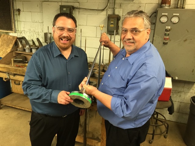 Ted Waggoner and Bach no. 7 bell mandrel at Bach factory in 2015